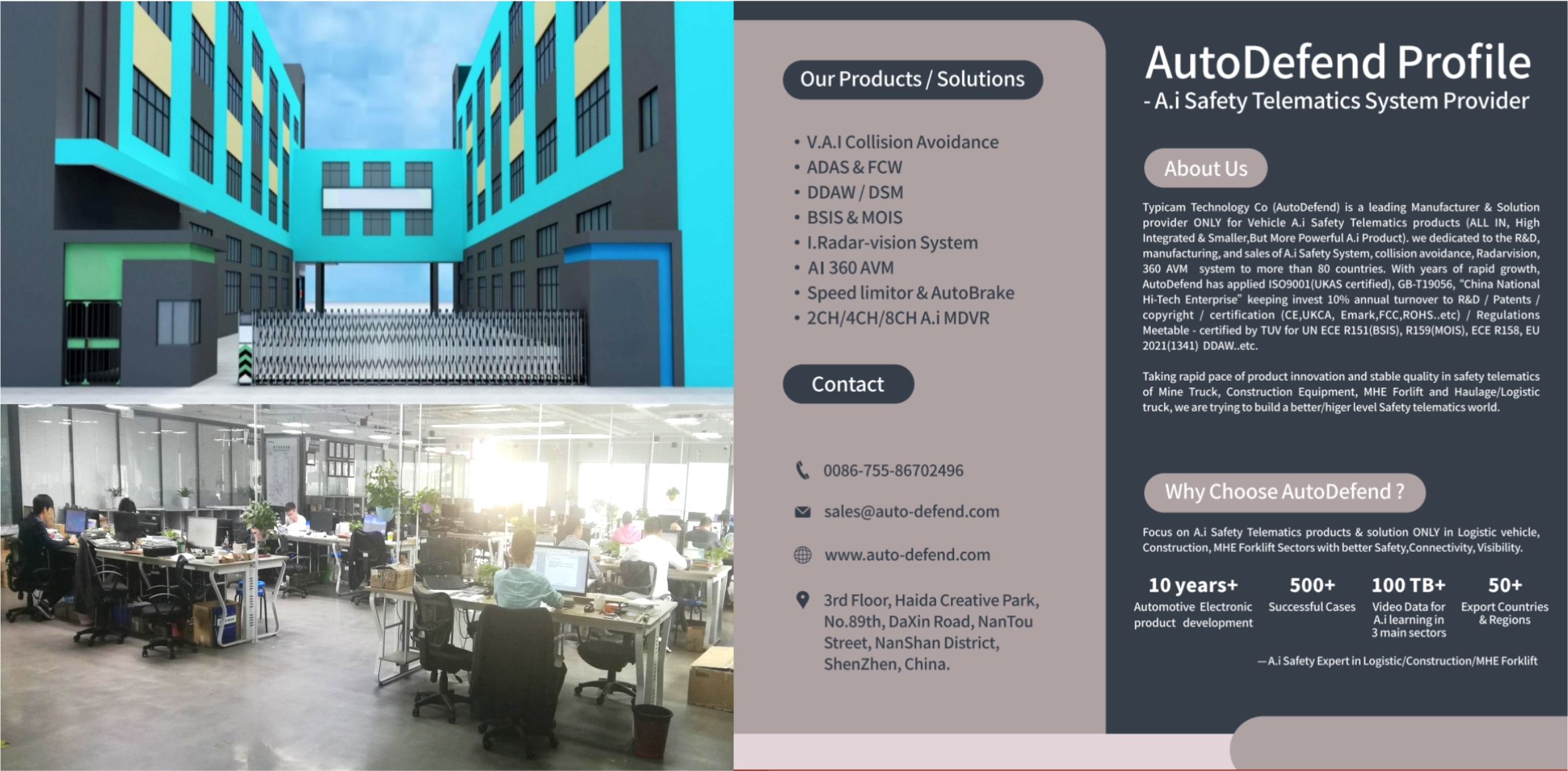 AutoDefend is a pioneering commercial vehicle fleet Ai video safety telematic system manufacturer & solution provider, since 2018, we focus on new cutting-edge technologies such as intelligence artificial system, include ADAS,DSM, collision avoidance system mainly in Road construction/mining/MHE equipments and Logistic industries. With advanced production facilities and reliability test equipment,Auto Defend Compliance with all necessary certifications ISO 9001、EMC、FCC、ROHS、E-mark IP69K..etc.and win the trust & recognized by global partners and suppliers.